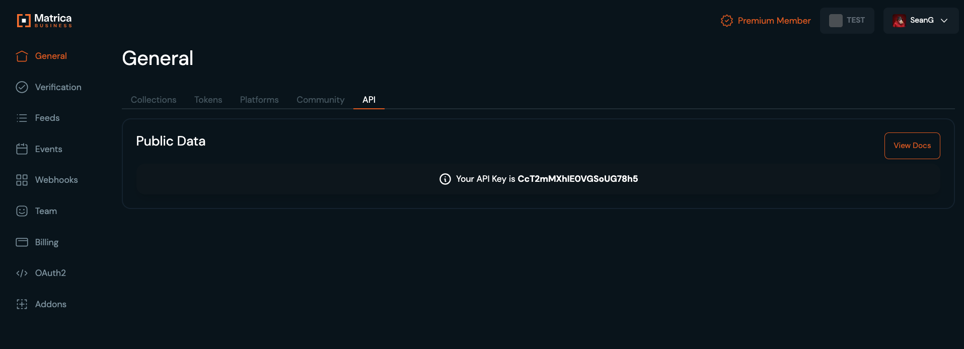 You API key can be found under the the 'API' tab, under the "General" on the Matrica Business site.